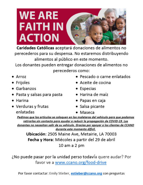 Catholic Charities will begin accepting donations of non-perishable foods for their food pantry on April 29 on Wednesdays from 10AM – 2PM at 2505 Maine Ave, Metairie 70003.