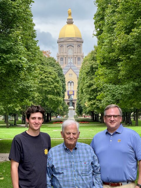 Trey Reymond (far right) at his alma mater University of Notre Dame with his son Lee and father Leon, Jr.