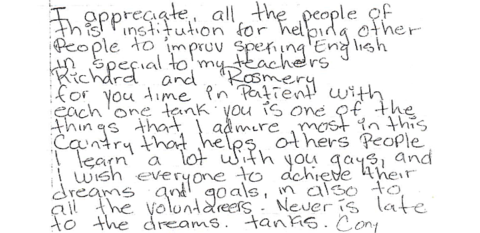 “I appreciate all the people of this institution for helping other people to improve speaking English, in special to my teachers Richard and Rosemary for your time and patience. Thank you. [This] is one of the things that I admire most in this country that helps other people. I learned a lot with you guys, and I wish everyone to achieve their dreams and goals. Also to all the volunteers. [It is] never too late to go for your dreams. Thanks, Cory”