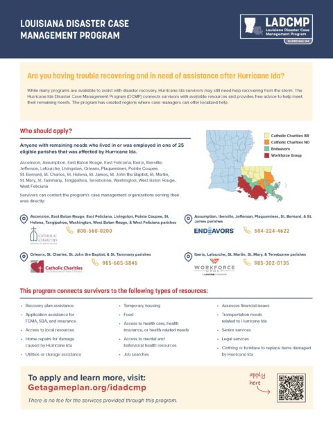 For more information on the Louisiana Disaster Case Management Program go to: Getagameplan.org/idadcmp
