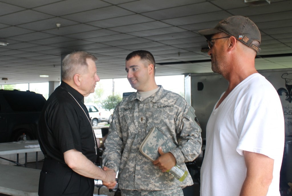 Archbishop Aymond meets a member of the LA National Guard at the Plaquemines Emergency Operation Center – 08/30/12