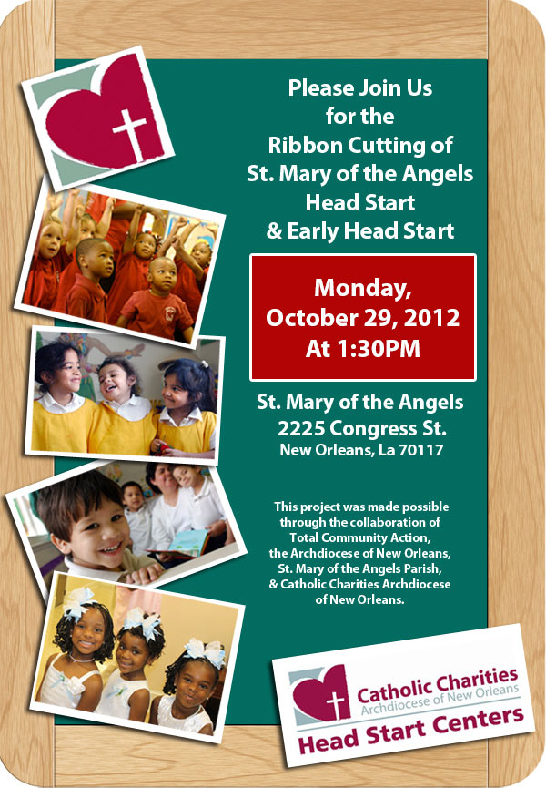 You’re invited to the rescheduled Ribbon-cutting Ceremony and Blessing by Archbishop Gregory Aymond to commemorate the opening of St. Mary of the Angels Head Start and Early Head Start! Monday, October 29, 2012 at 1:30PM at 2225 Congress St. in New Orleans.