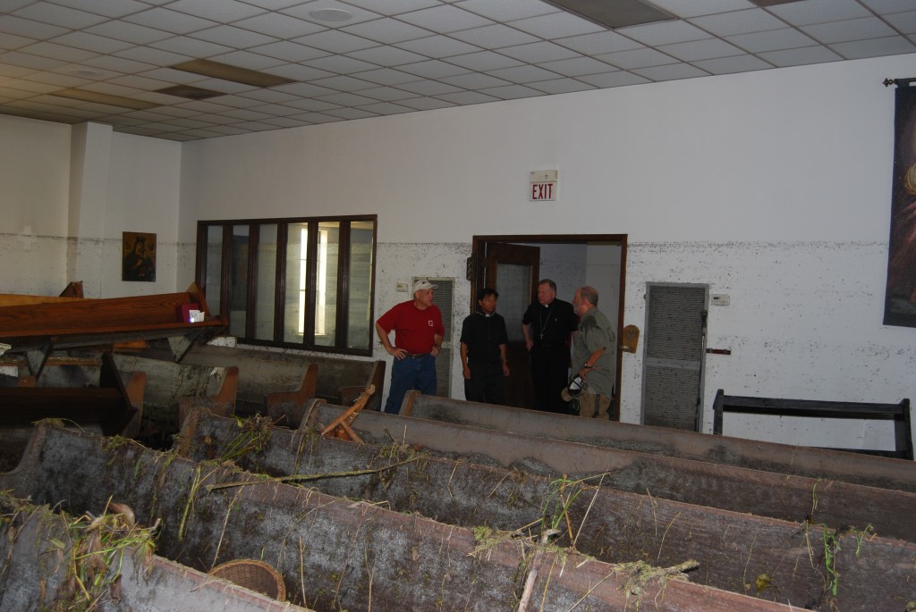 What: Work in small teams on storm-related projects. Distributing food and cleaning supplies at tent located in front of Assumption Church. Delivering cleaning supplies and food to homeowners.